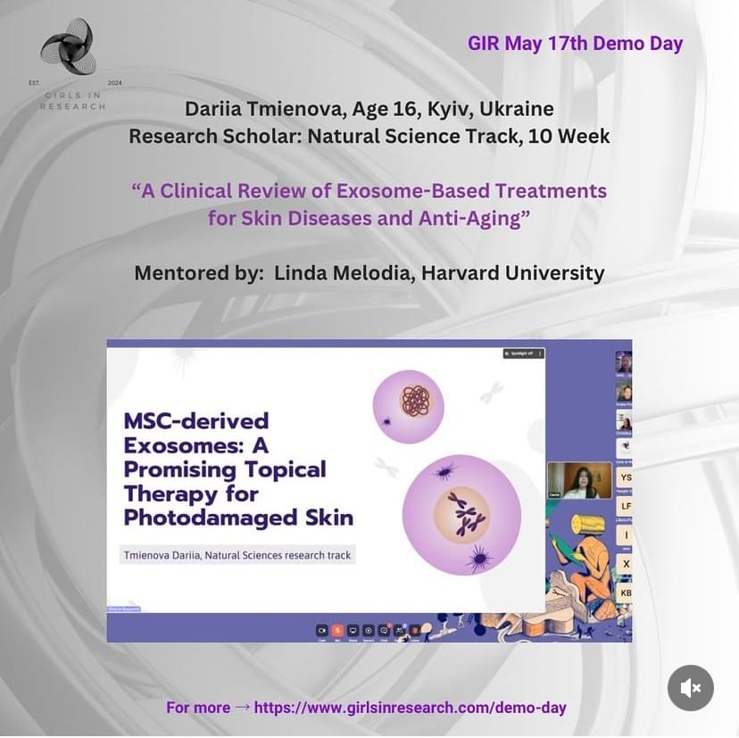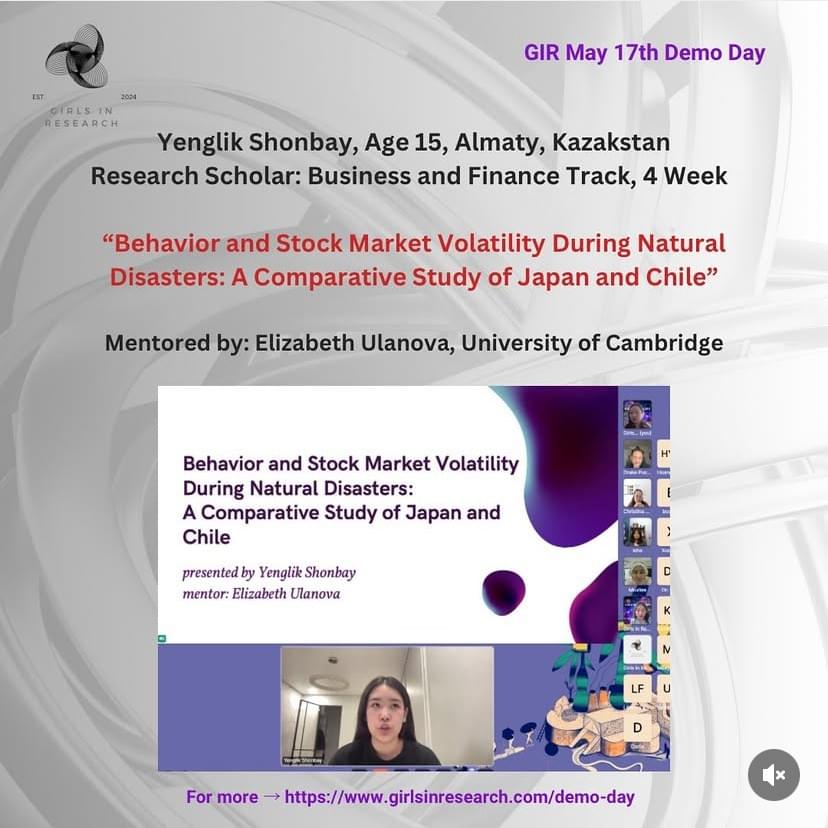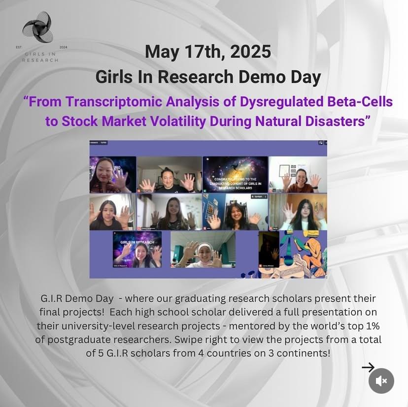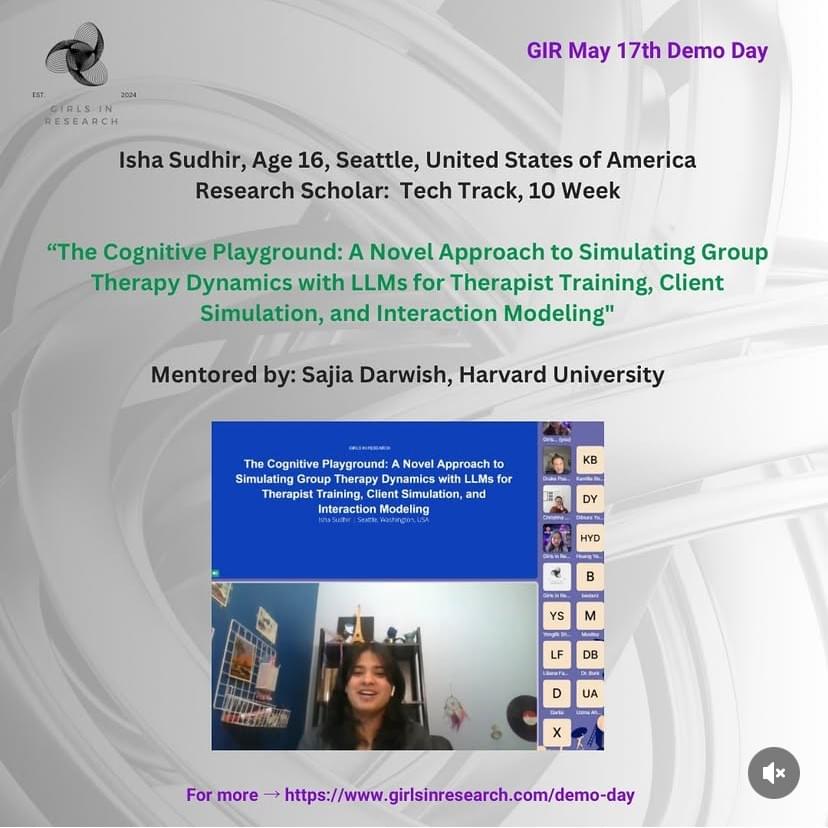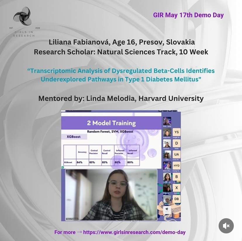 - Saturday May 17th, 2025 Demo Day- From Transcriptomic Analysis of Dysregulated Beta-Cells to Stock Market Volatility During Natural Disasters- Full Program (PDF Click Here)- Join us for Demo Day, where our graduating research scholars present their final projects! Each scholar will deliver a 7-minute presentation, followed by insightful feedback from the panel. A total of 5 GIR scholars from 4 countries on 3 continents will be graduating!- Date and Time: 11 AM EDT - 1:00 PM EDT (New York Time Zone / UTC-4)- Live Webstream Link (Click Here): whereby.com/girls-in-research- Registration Link (Click Here): https://lu.ma/0ik94p5b- 11:00am EST Opening Remarks & Panelists Introduction by CEO, Elizabeth Ulanova- 11:15am EDT Liliana Fabianová, Age 16, Presov, Slovakia- Research Scholar: Natural Sciences Track, 10 Week- "Transcriptomic Analysis of Dysregulated Beta-Cells Identifies Underexplored Pathways in Type 1 Diabetes Mellitus"- Mentor: Linda Melodia, Harvard University- 11:30am EDT Yenglik Shonbay, Age 15, Almaty, Kazakstan- Research Scholar: Business and Finance Track, 4 Week- “Behavior and Stock Market Volatility During Natural Disasters: A Comparative Study of Japan and Chile”- Mentor: Elizabeth Ulanova, University of Cambridge- 11:45am EDT - 12:00PM EDT - 15 minutes Intermission- 12:00pm EDT Dariia Tmienova, Age 16, Kyiv, Ukraine- Research Scholar: Natural Science Track, 10 Week- “A Clinical Review of Exosome-Based Treatments for Skin Diseases and Anti-Aging”- Mentor: Linda Melodia, Harvard University- 12:15pm EDT Isha Sudhir, Age 16, Seattle, United States of America- Research Scholar: Tech Track, 10 Week- “The Cognitive Playground: A Novel Approach to Simulating Group Therapy Dynamics with LLMs for Therapist Training, Client Simulation, and Interaction Modeling"- Mentor: Sajia Darwish, Harvard University- 12:30pm EDT Leila Bolat Age 18, Almaty, Kazakstan- Research Scholar: Natural Sciences Track, 10 Week- “Impact of HSV-1 and CMV Viruses in Alzheimer's Disease"- Mentor: Christine Major-Styles, Imperial College London- 12:45pm EDT Closing Remarks & Processions by CEO, Elizabeth Ulanova